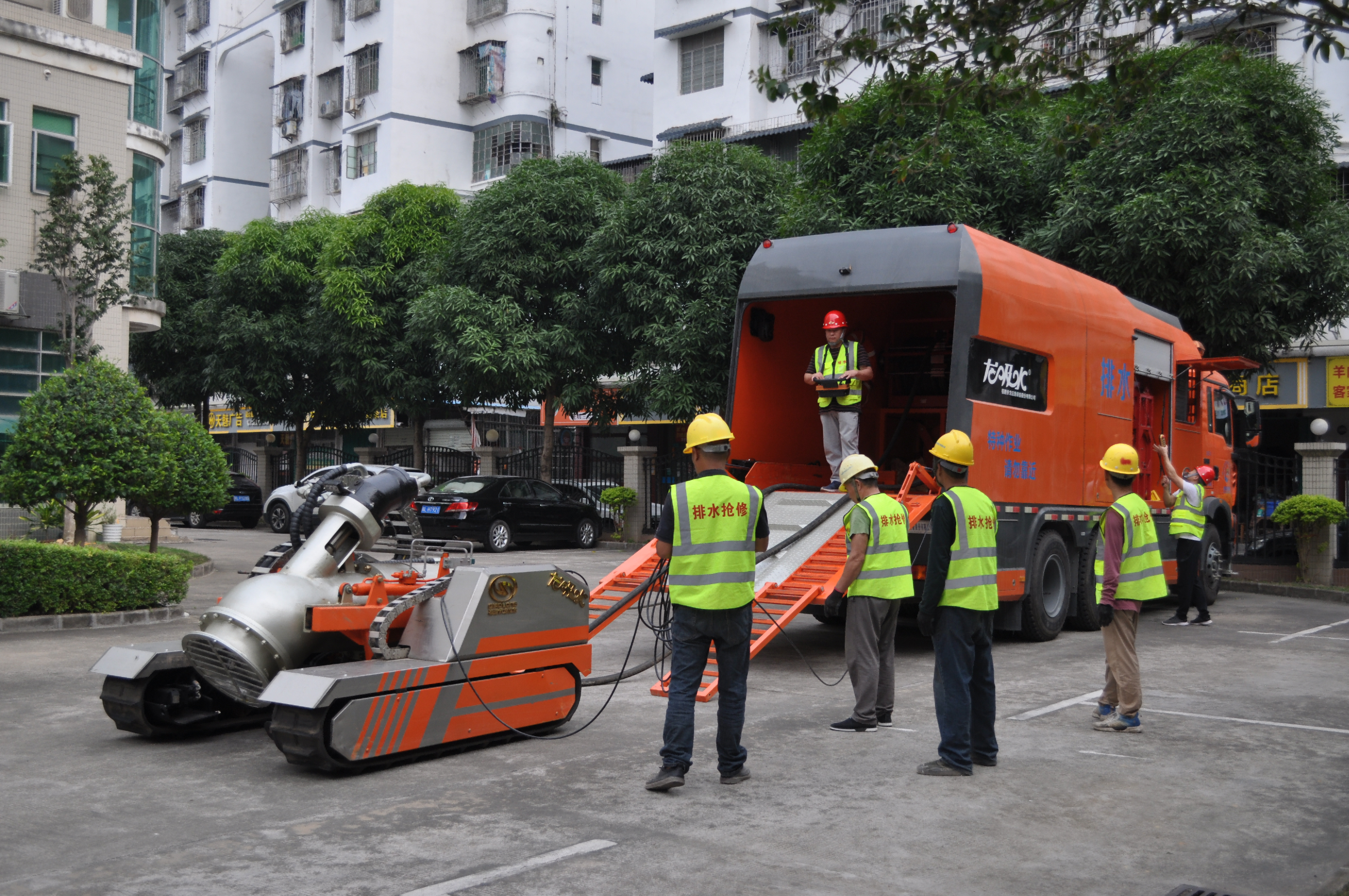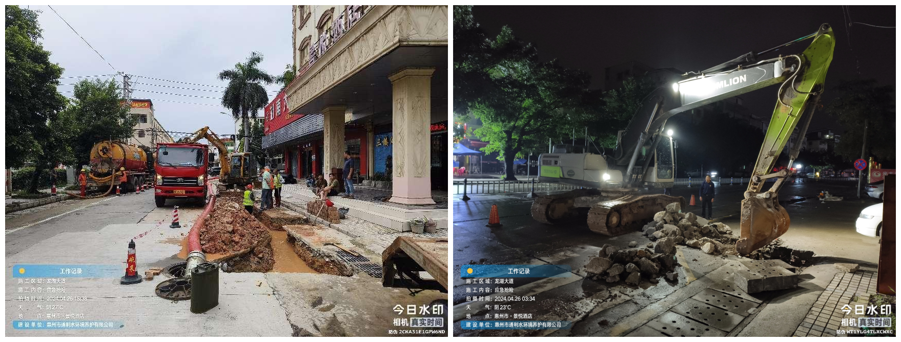 4月25日上午,收到龙湖大道(水口医院段,属惠城区水口街道办管护范围)严重积水的汛情求助后,集团陈勉彬董事长率队迅速到场支援,调配2台龙吸水设备和12人到现场进行紧急排涝。在集团领导的统一要求和指挥下,通利公司于当天晚上大雨过后,对该段管道进行应急抢修,经过一天两夜不分昼夜雨晴的连续作战,于4月27日凌晨,顺利完成临时应急抢修工作。