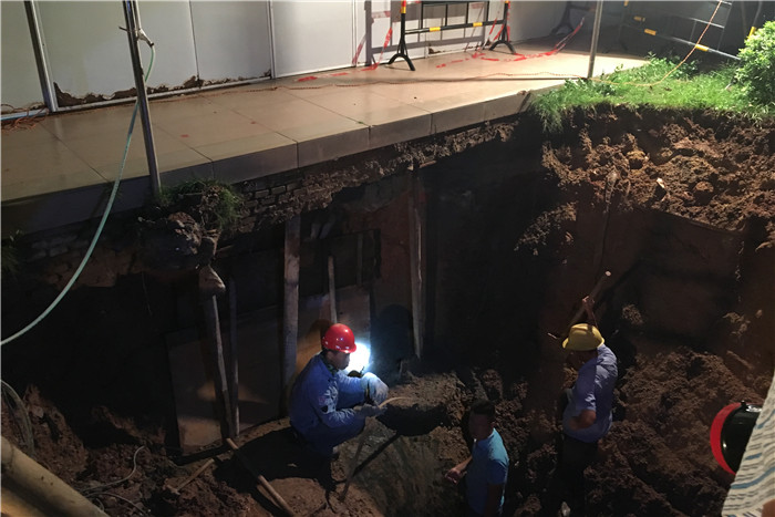 7月13日,该工程正式动工。8月14日凌晨1:00,施工人员开始对江北水厂外的DN1600管道接驳处和该厂内的堵板焊接处进行双向同时施工。在确保安全文明施工的前提下,经过21个小时的紧张施工,于8月15日下午4:00终于成功完成该段DN1600上水管迁改接驳通水工作,江北水厂恢复正常供水。