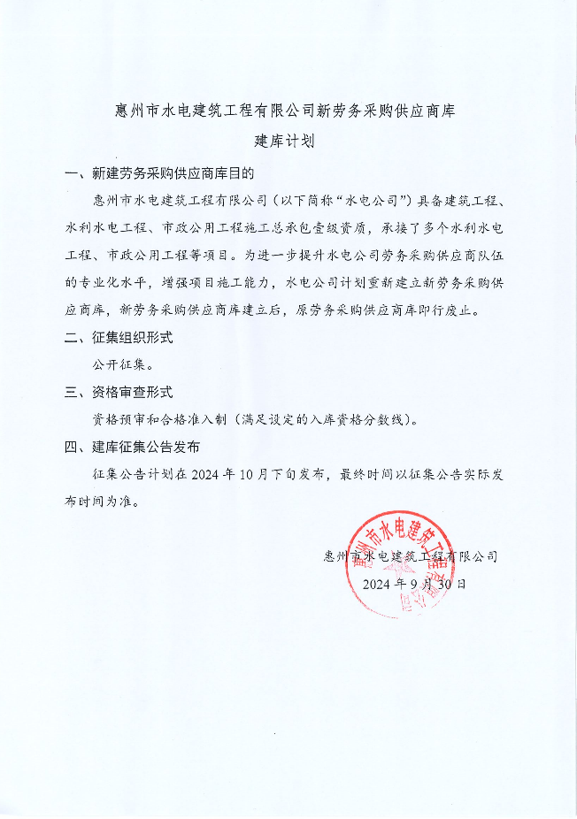 惠州市水电建筑工程有限公司新劳务采购供应商库建库计划