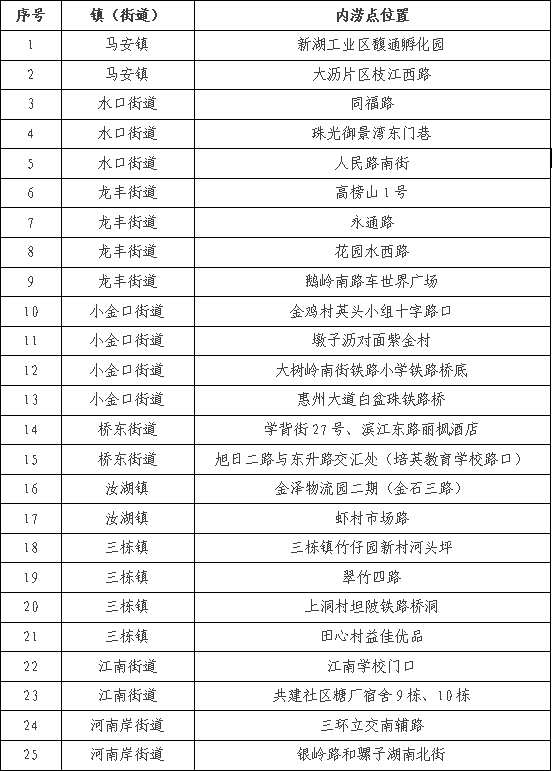 3.建设地点:惠城区辖下小金口、汝湖、桥东、水口、龙丰、江南、河南岸、马安、三栋共6个街道及3个镇区,合计25处内涝积水点。