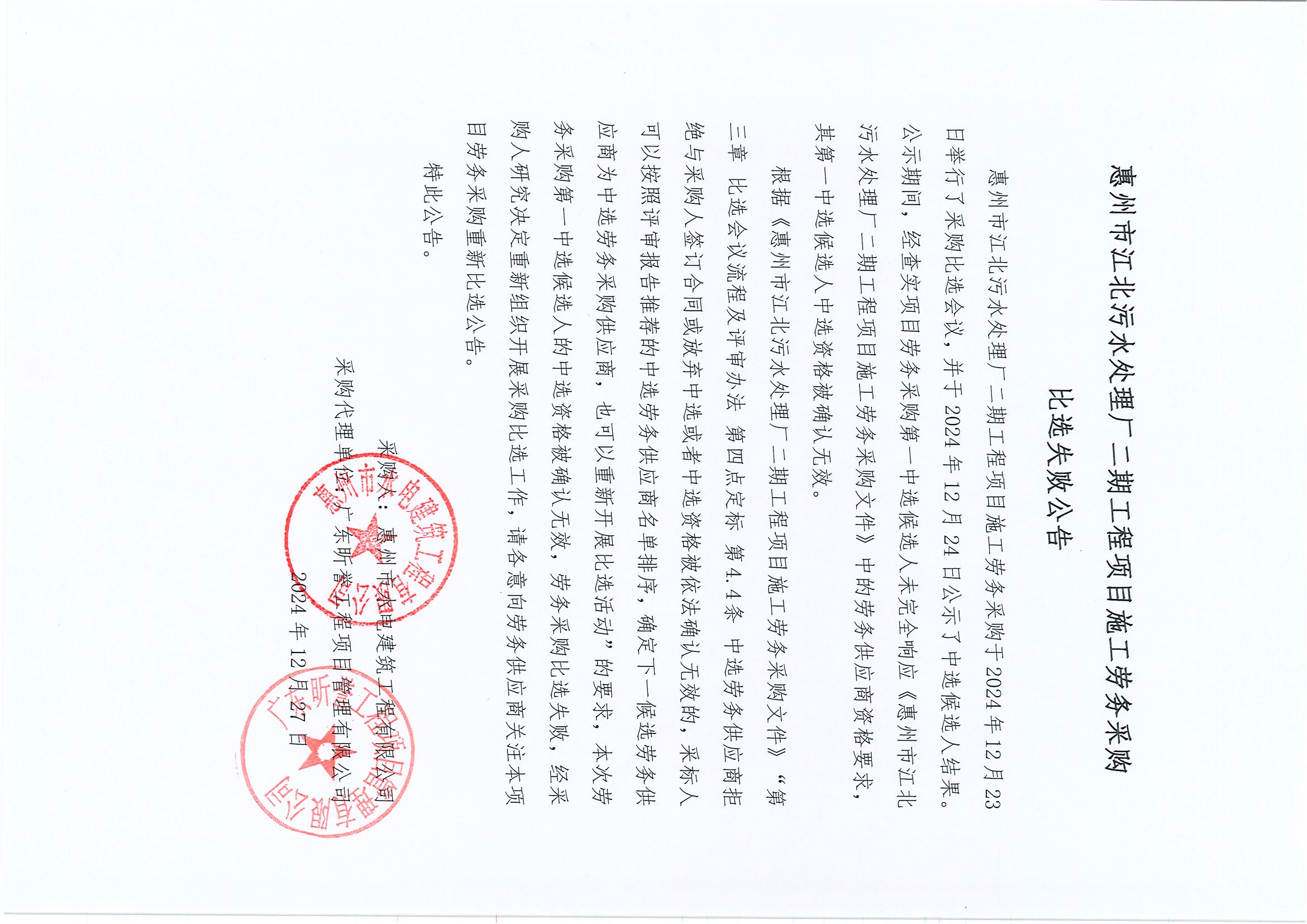 惠州市江北污水处理厂二期工程项目施工劳务采购比选失败公告
