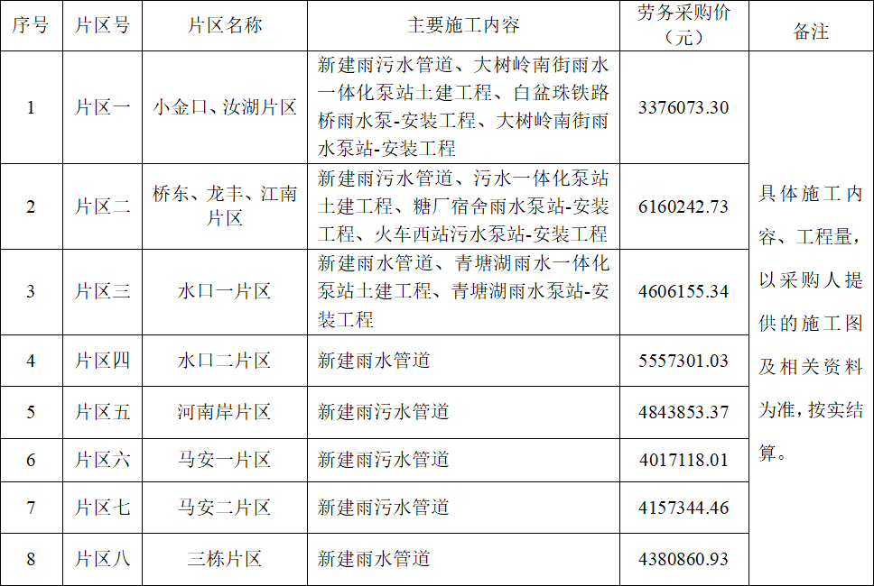 2.4本项目划分为8个片区进行劳务采购,具体划分见下表: