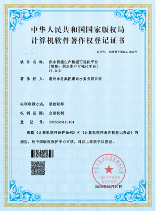 3月10日,五楼自拍 所属惠东水务公司技术信息中心自主开发的软件系统《供水设施生产数据可视化平台》、《自适应絮凝剂投加控制系统》经国家版权局中国版权保护中心审查,获计算机软件著作权登记证书。
