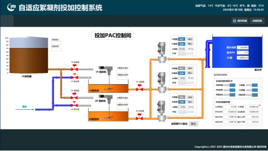 系统主要功能 该系统具备絮凝剂智能投加功能,通过多参数水质数据(流量/温度/浊度/pH等)自动调节PID实现精准控制,同步兼容手动干预模式。实时监测药罐液位与搅拌状态,确保药剂配备充分、混合均匀,保障絮凝工艺稳定高效运行。