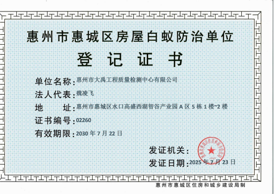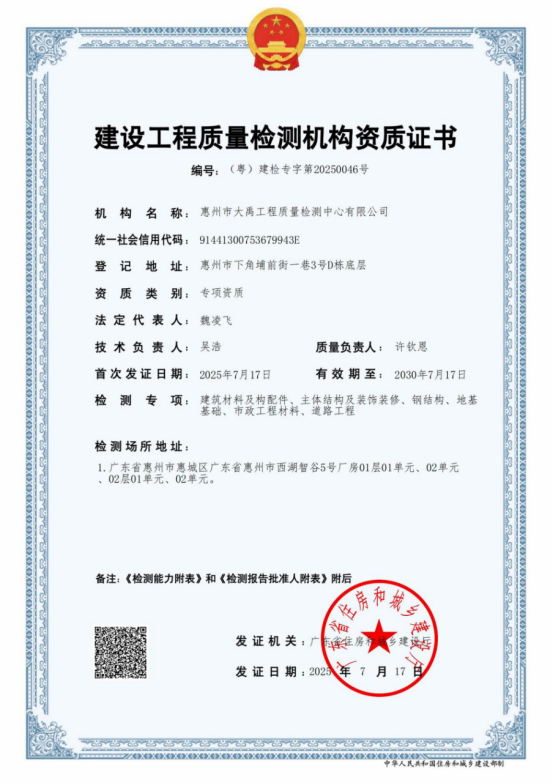 近日,五楼自拍 大禹检测公司顺利拿下广东省住房和城乡建设厅颁发的建设工程质量检测机构资质证书(编号:(粤)建检专字第20250046号),资质范围覆盖建筑材料及构配件、主体结构及装饰装修、钢结构、地基基础、市政工程材料、道路工程等六大专项,突显大禹检测公司在建设工程质量检测领域的整体实力迈上新高度;同步获惠州市惠城区住房和城乡建设局颁发的房屋白蚁防治单位登记证书(编号:02260)。至此,公司成为惠州少数具备“检测+防治”一体化服务能力的机构。