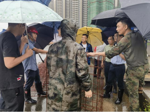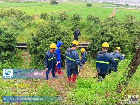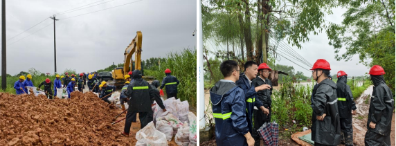 在潼湖岗头新围,8月5日早上,水电公司接到赴潼湖岗头新围抢险命令,抢险队70人立即集结待命,完成应急抢险安全技术交底工作后乘车前往仲恺高新区潼湖岗头新围开展子堤加高加固抢险。水电公司总工程师谢武带队赶赴险情现场勘查,研讨抢险方案,指导抢险工作。12时30分,抢险人员、机械设备和抢险物资已到达现场第一作业点开展抢险。因连日降雨,现场河水水位高涨几近漫堤,险情非常紧急。抢险队员或铲装沙袋、或搬运堆砌、或机械清障,大家分工协作,有条不紊开展子堤加高。经过全员不懈努力,仅用4个小时,第一抢险点子堤加高加固就已完成,顺利完成抢险任务。