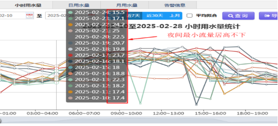 位于三环南路的 TCL 翠园小区,水压不稳的情况时有发生。我司通过分区计量系统与营销系统的比对分析,发现该小区夜间最小流量异常偏高,初步判定存在物理漏损。