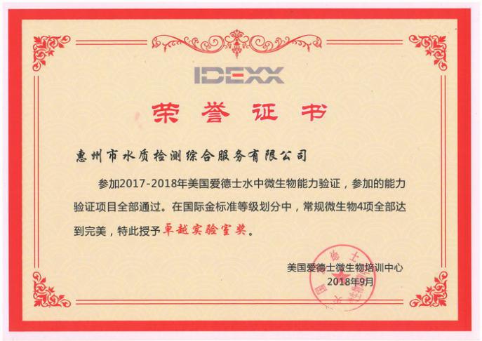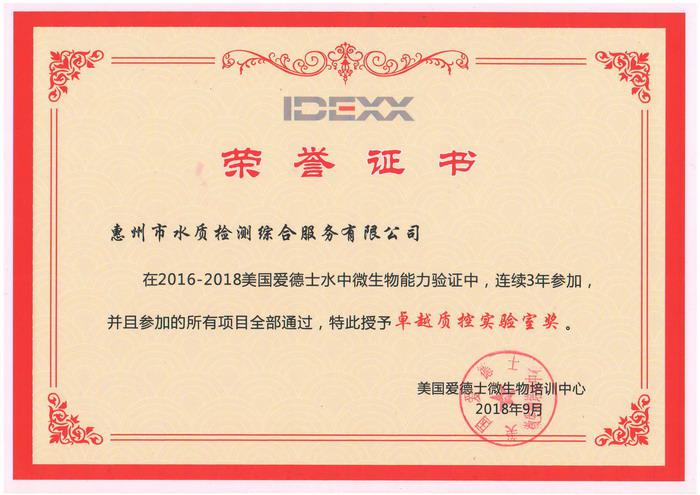 2016-2018年国标4项水中微生物国际能力验证中表现卓越,被美国国爱德士微生物培训中心同时授予“卓越实验室奖”和“卓越质控实验室奖”荣誉证书及奖牌。