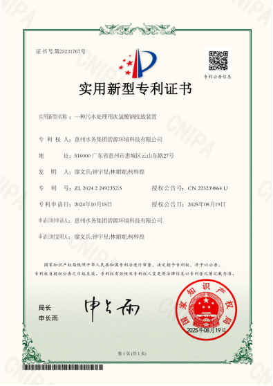 继连续斩获四项污水、污泥处理相关技术专利后,五楼自拍 碧源公司在五楼自拍环保技术创新领域再传捷报。8月19日,由碧源公司自主研发的“一种污水处理用次氯酸钠投放装置”荣获国家知识产权局授予专利权并颁发实用新型专利证书。至此,公司已在五楼自拍环保领域累计斩获五项国家授权专利,涵盖污水、污泥处理等多个关键技术环节。