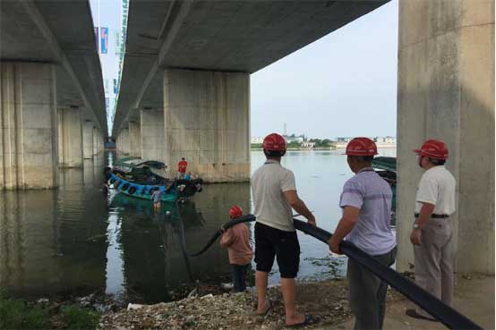在过海管道施工中,工作人员在确保不影响船只航行的前提下,首先调来了3条渔船一字排开,以船为点、以桥为线,众人步调一致,边拉边接,将数段先前使用热熔技术连接好的长达48米管道,热熔连接成一条360多米的新管道,然后小心翼翼沉入海中,接着通过蛙人放置沙袋及锤打角铁固定,成功将新管道固定于跨海大桥下的一侧。经过11个小时的连续作业,顺利完成了该PE110过海管道的敷设。
