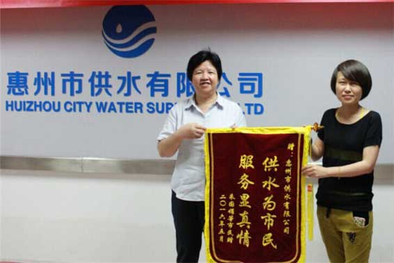 5月10日下午,家住惠城区花边岭三亚塘东的客户蒋女士满怀欣喜地来到市供水公司,将一面绣着“服务显真情、供水为市民”的锦旗郑重递到供水公司领导手中。