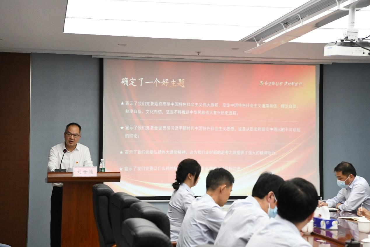 刘世通为大家讲授了题为《奋进新征程,建功新时代》的专题党课,分享了对党的二十大精神所学所思所悟,深入浅出解读了党的二十大重大意义、重大成果、重大部署。他围绕“如何统筹、实干、高效落实”提出了五点意见:一是要同强化党的政治建设相结合,推动党建融入公司治理。要持续强化理论武装,准确把握习近平新时代中国特色社会主义思想的立场观点方法。同时,充分发挥党总揽全局、协调各方的领导核心作用,将党的建设融入公司治理,强根铸魂凝聚合力。二是要同促进企业提质增效相结合,推动公司高质量发展。要以效益为中心、项目为抓手、任务指标为方向,以党的二十大精神有力引领企业管理、效益、安全、疫情防控等工作齐头并进。坚持以精细化管理,推动企业经营的精耕细作、持续改善。三是要同深化国企改革相结合,构建国企发展新格局。要切实以改革完善管理体制机制、激发创新创造活力、推动企业高质量发展。重点是要进一步厘清党组织、董事会、经理层之间的权责边界,使中国特色现代企业制度更加成熟定型。四是要同“百日攻坚”行动相结合,决战决胜全年任务目标。要切实增强完成重点任务的紧迫感和责任感,以更快速度、更高标准、更严要求,打造“优质、安全、高效、廉洁”工程,确保到今年底,全面完成年度预期目标。五是要同推进全面从严治党相结合,营造风清气正的发展环境。要聚焦重点领域、“关键少数”,推动主体和监督责任同向发力、落到实处;要强化正风肃纪反腐,结合当前“庸懒散拖”问题专项教育整治活动,强化作风建设,增强服务意识,树立健康良好的水务人形象。