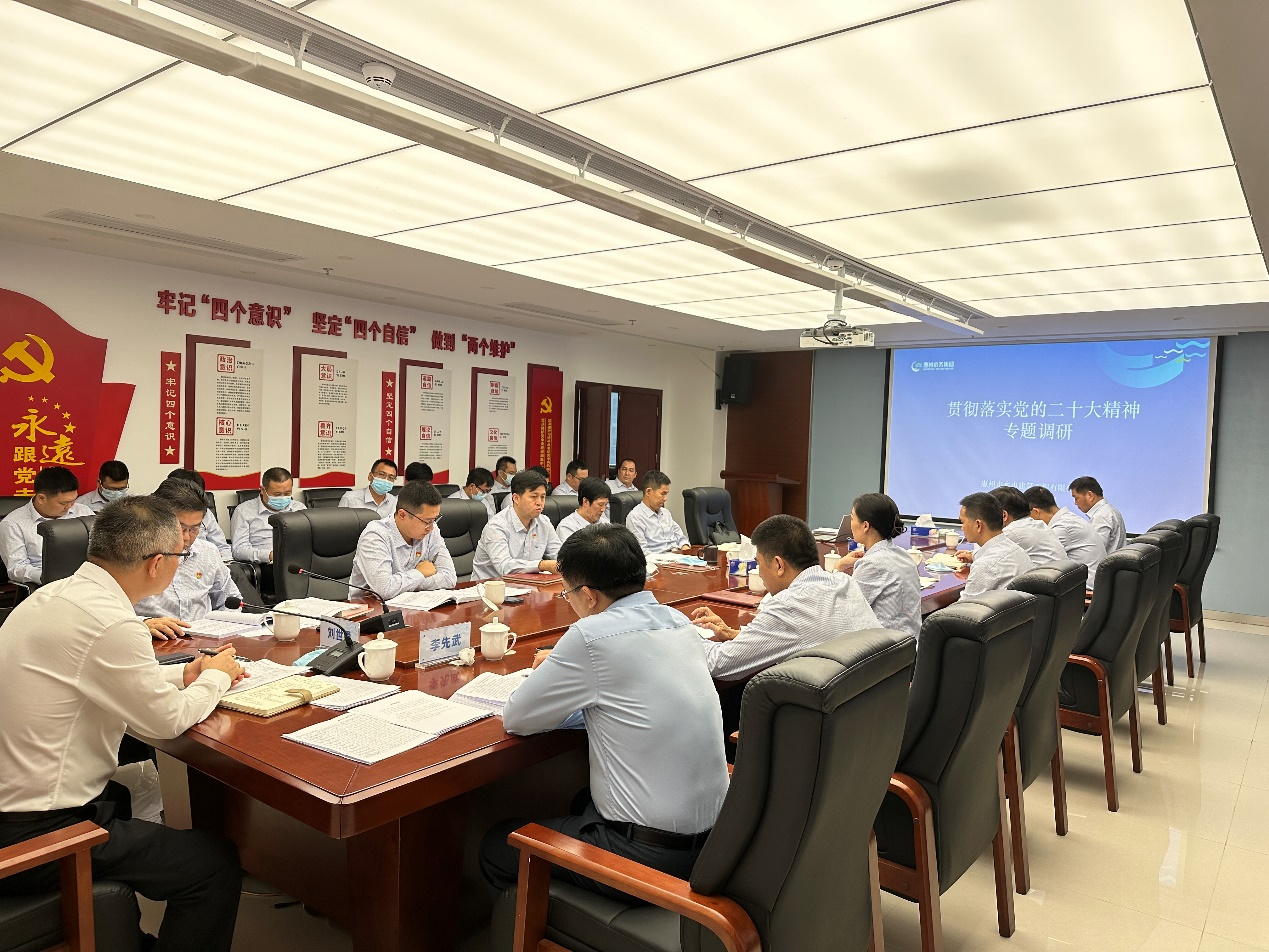 在贯彻落实党的二十大精神专题调研会上,刘世通听取了公司学习宣传贯彻党的二十大精神推进落实情况,并就现存问题与企业管理人员开展交流。他对公司前三季度工作给予肯定,鼓励企业要继续保持攻坚的拼劲,确保全年目标的顺利完成,并对公司业务经营、管理提升和未来发展提出了具体要求。他指出,要进一步深化党建引领,为企业高质量发展保驾护航。要扎实推进党的二十大精神进企业、进项目;要有计划做好企业创优升级,加强企业内控制度建设,提升项目精细化管理;要进一步加强人才引进与培养,挖掘有潜力的内部人才,建设企业人才梯队;要精准研判市场形势,积极打造业务发展新增长点。